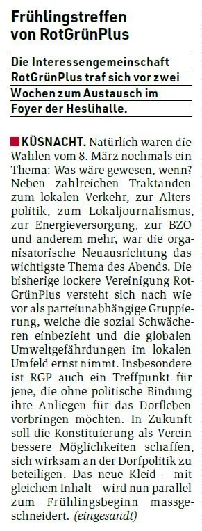 Mehr als zwanzig Interessierte fanden sich ein zum lebhaften Treffen von RotGrünPlus in der Heslihalle am 7. März. Zu reden gab die anstehende Ersatzwahl für den Gemeinderat. RGP stellt sich hinter die Kandidatur von Claudio Durisch. Die Anwesenden kennen Claudio Durisch mittlerweile seit einiger Zeit und halten ihn für einen ausgezeichneten zukünftigen Gemeinderat. Dies unter anderem dank seines umfassenden Wissens über die Belange der Dorfpolitik, aber auch wegen seiner klaren Stellungnahmen und seiner ausgleichenden Persönlichkeit.